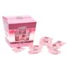 Ingredientes: Azúcar, jarabe de glucosa, agua, almidón de trigo, pétalos biológicos de rosas oleaginosas (0,6%), agua de rosas natural, colorante natural de extracto de rábanos (E163), ácido cítrico, aceite de rosa ecológico (0,03%). Puede contener trazas de nueces y pasas.